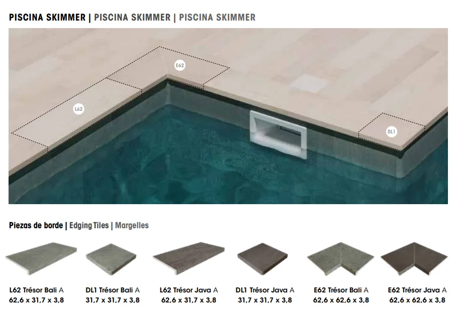 Rosa Gres Tresor Bali A. L 62,6X31,7 R.L62 1A je protivklizna rubna pločica od porcelanskog kamena za bazene. Elegantnog dizajna, otporna na hemikalije i UV zračenje, pruža sigurnost i dugotrajan izgled uz minimalno održavanje. Idealna za privatne i javne bazene.