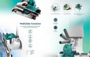 Opremljen je 360° okretnim točkićima, koji omogućavaju lako manevrisanje i potpunu pokrivenost bazena. Posebna WallGlide funkcija omogućava efikasno čišćenje zidova bazena, uključujući vertikalne površine, bez zaglavljivanja.