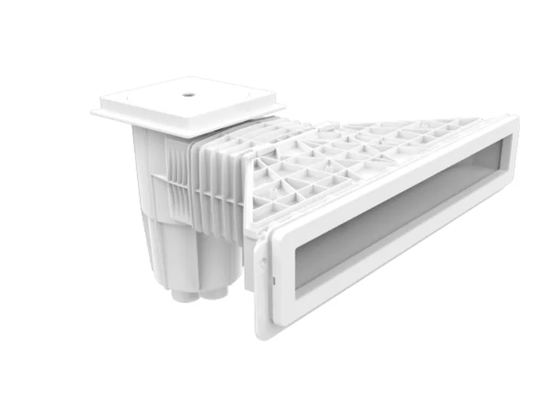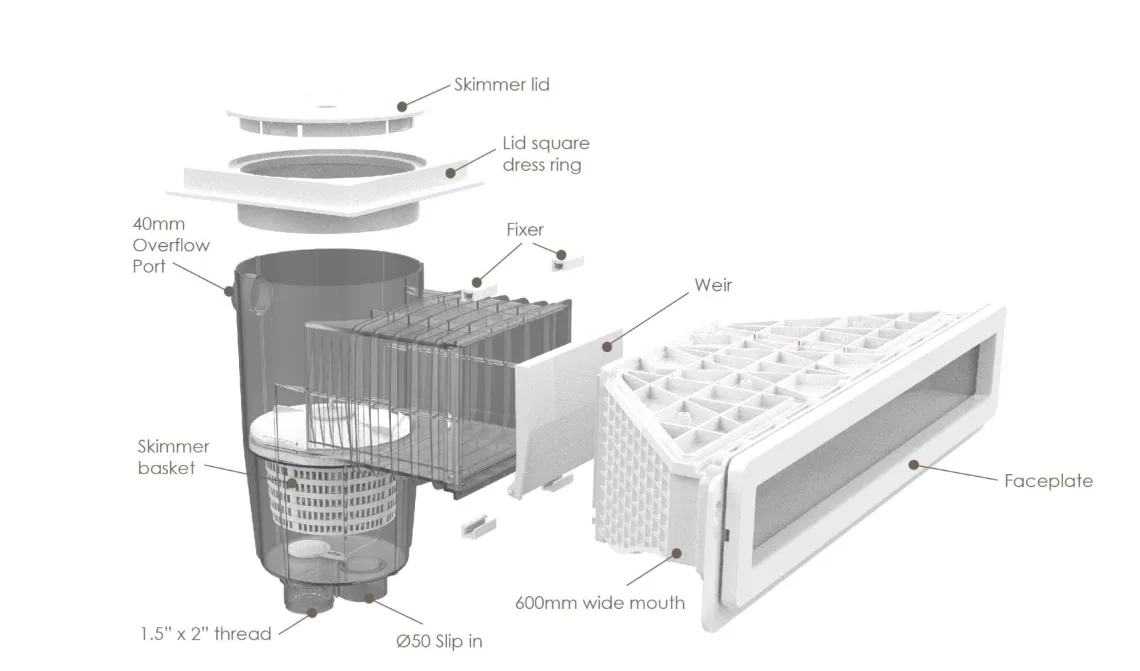 Ugrađuje se u zid bazena, na nivou vodene linije, i povezuje se sa sistemom filtracije.