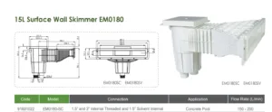 Plitki skimer Emaux namenjen je betonskim bazenima sa ograničenom dubinom ugradnje i omogućava efikasno uklanjanje površinskih nečistoća uz protok do 5 m³/h.