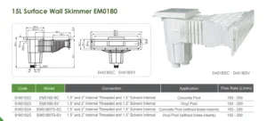 Plitki skimer Emaux namenjen je bazenima sa PVC lajnerom i idealan je za ugradnju u zidove sa ograničenom dubinom, uz pouzdan protok do 5 m³/h.