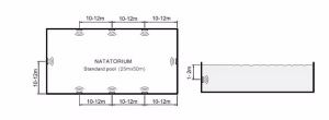 - Bazen 10 × 5 m – 2 podvodna zvučnika