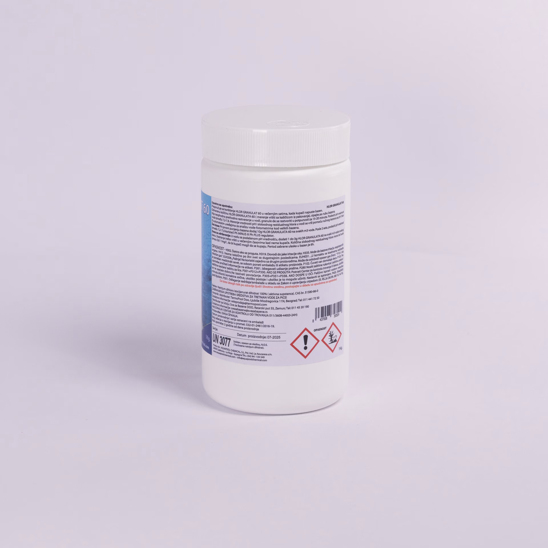 Hlor Granulat 60 je efikasno sredstvo za dezinfekciju bazenske vode koje uništava bakterije i alge, idealno za šok tretman i svakodnevno održavanje čiste i bezbedne vode.