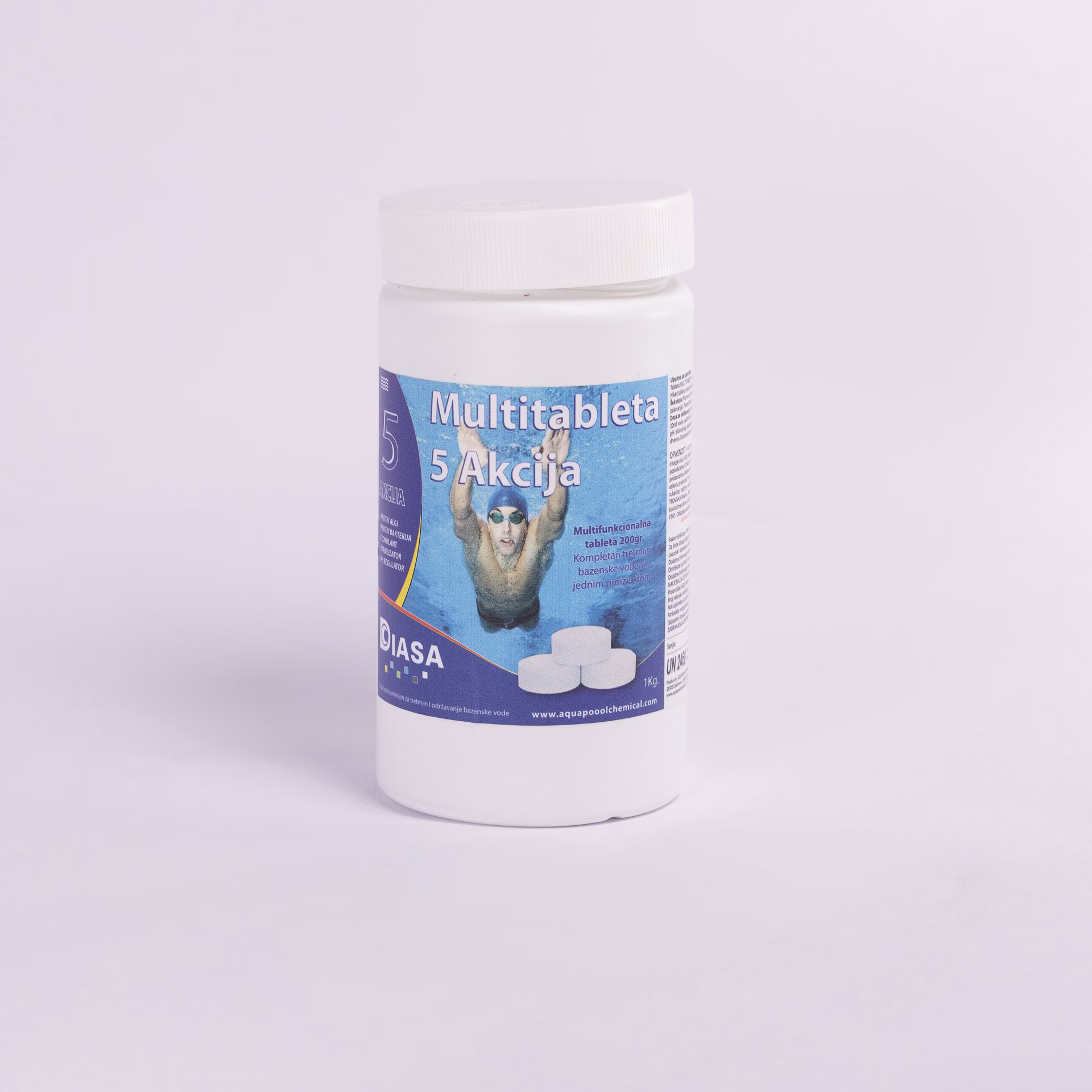 Multi tablete 5 u 1 su višenamensko sredstvo koje kombinuje dezinfekciju, algicid, flokulant, stabilizator i antibakterijsku zaštitu za jednostavno i efikasno održavanje bazenske vode.