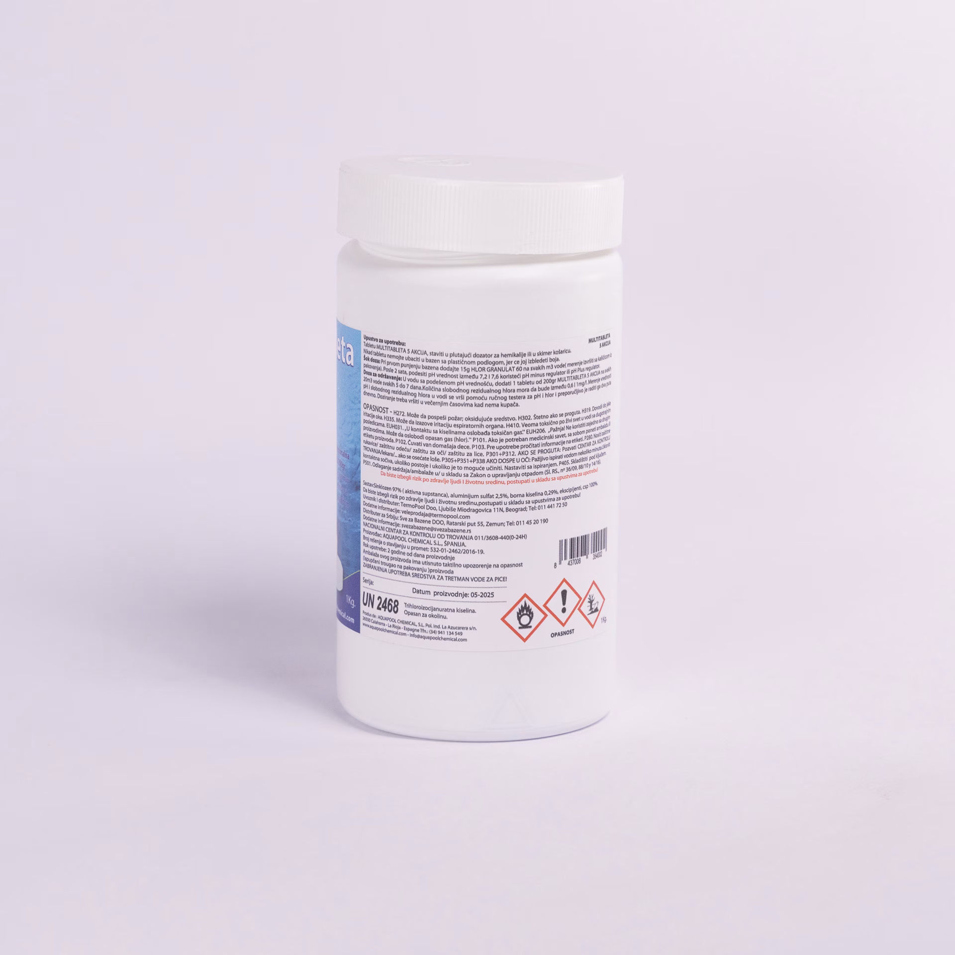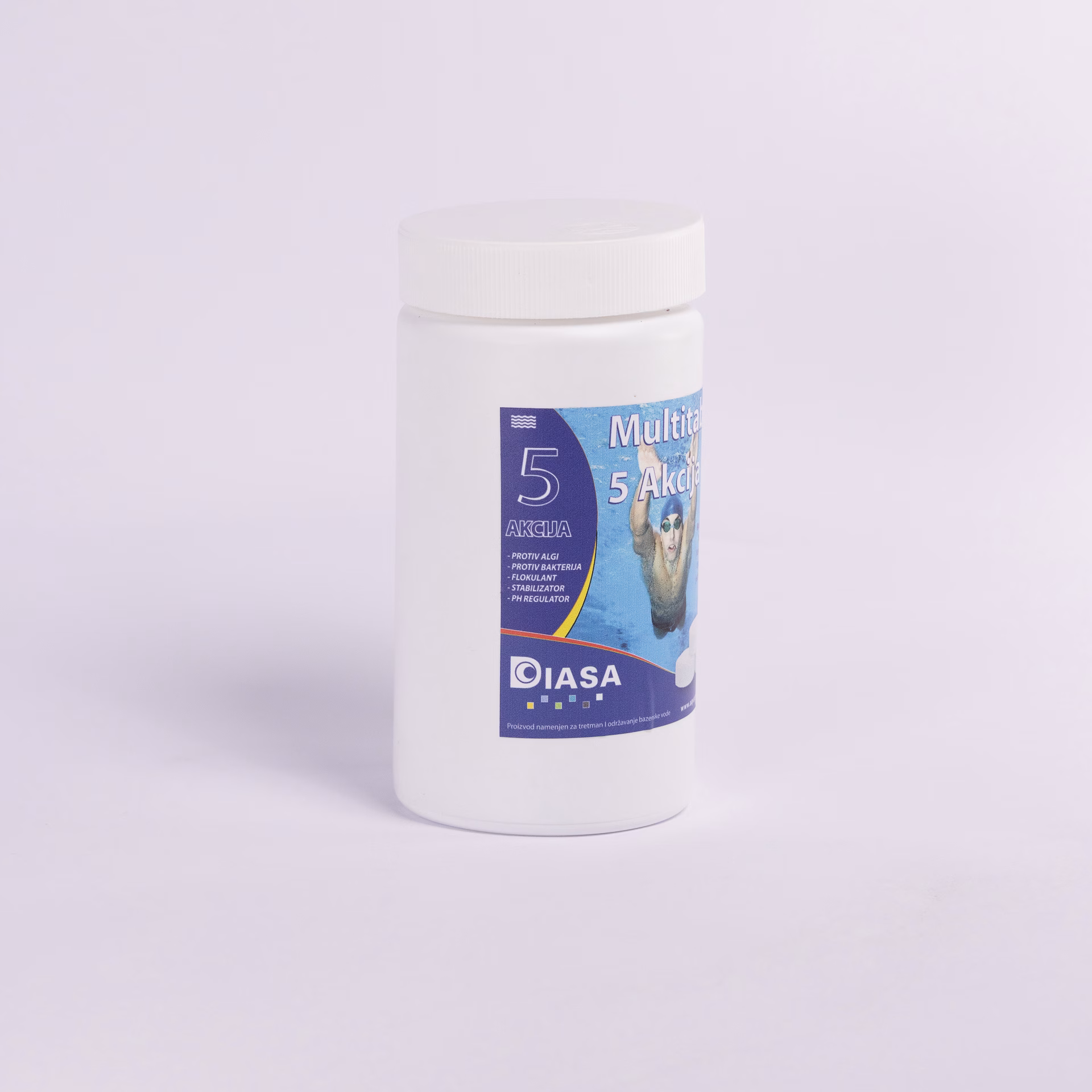 Multi tablete 5 u 1 su višenamensko sredstvo koje kombinuje dezinfekciju, algicid, flokulant, stabilizator i antibakterijsku zaštitu za jednostavno i efikasno održavanje bazenske vode.