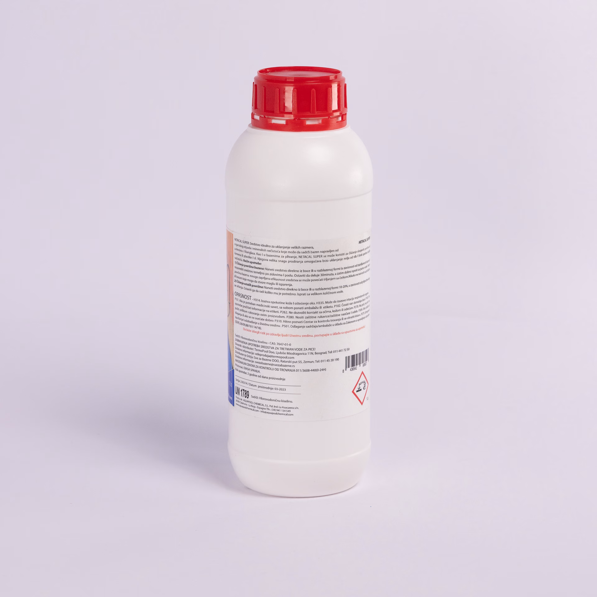 NETACAL SUPER je snažno kiselinsko sredstvo za uklanjanje kamenca, rđe i tvrdokornih nečistoća sa bazena od poliestera, fiberglasa, plastike i kamena – idealno za dubinsko čišćenje pre početka sezone.