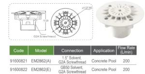 Mlaznica podna 2″ fi50 12 m³/h Emaux namenjena je povratu vode kroz dno bazena, obezbeđujući ravnomernu cirkulaciju i efikasan rad filtracionog sistema.