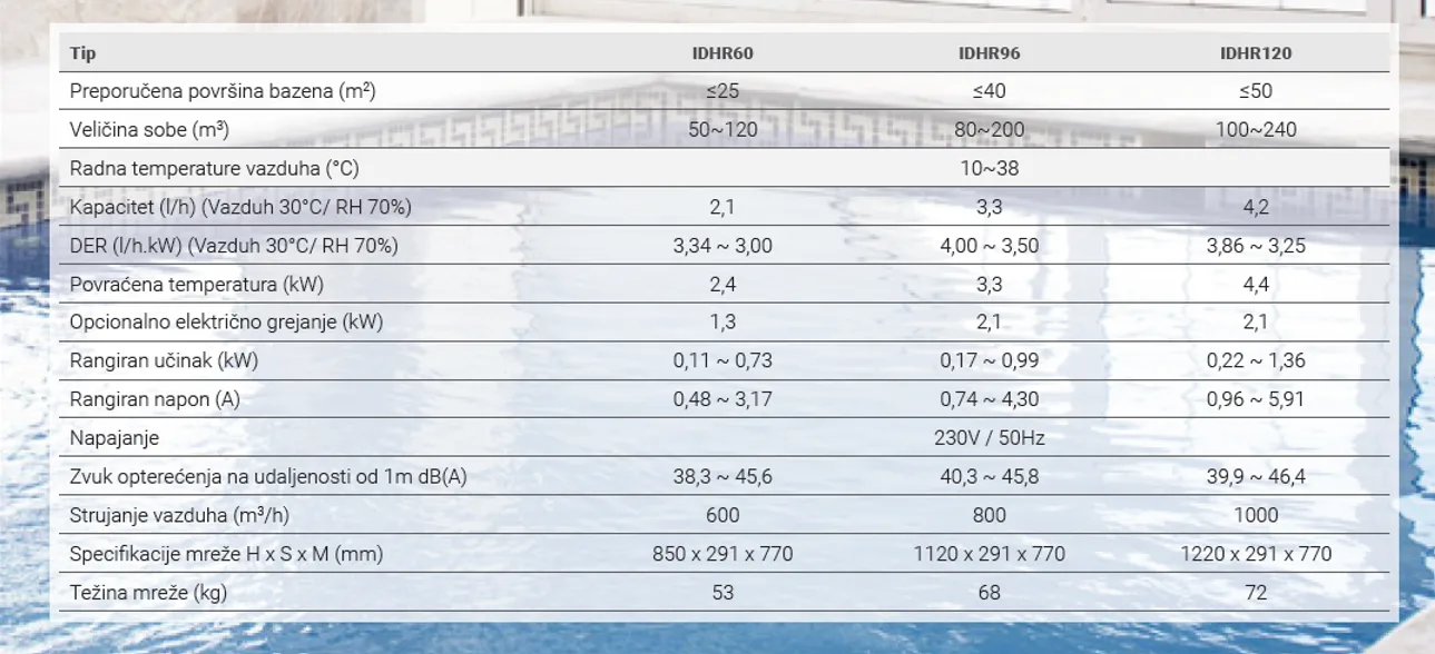 Sa kapacitetom odvlaživanja vode do 4 l/h pri standardnim uslovima (30 °C i 80 % relativne vlažnosti vazduha) i snagom toplote do 3,3 kW, IDHR96 je pogodan za prostorije sa površinom baze bazena do 40 m². Uređaj može biti montiran na pod ili na zid, uz obavezno obezbeđivanje odvodnog sistema za kondenzat.