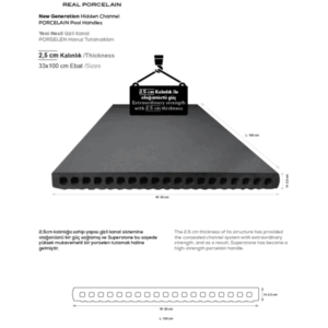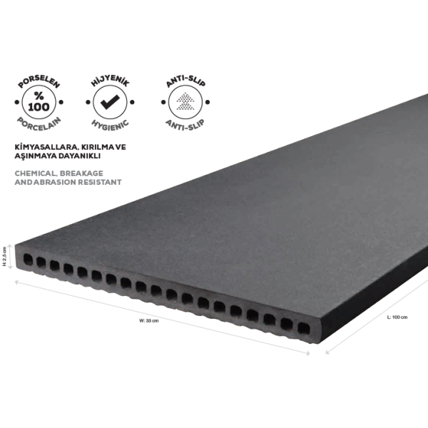 Nerostone je savremeni porcelanski ivičnjak dimenzija 100x33x2,5 cm, namenjen bazenima sa skrivenim kanalom, koji kombinuje visok kvalitet, estetski dizajn i otpornost na vodu, fleke i vremenske uslove.