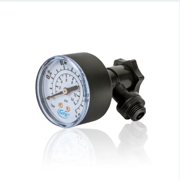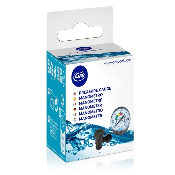 Manometar sa adapterima 32 i 38 GRE precizno meri pritisak u filter sistemima bazena i dolazi sa adapterima za montažu na creva prečnika 32 mm i 38 mm.