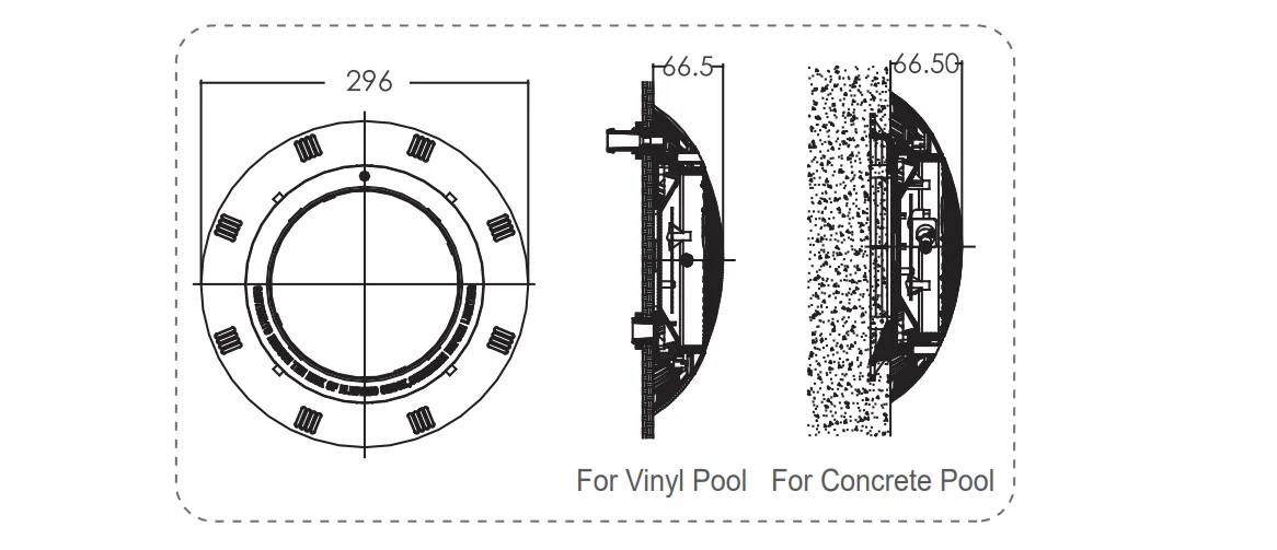 - U betonskim ili PVC lajner bazenima sa bočnom ugradnjom svetla