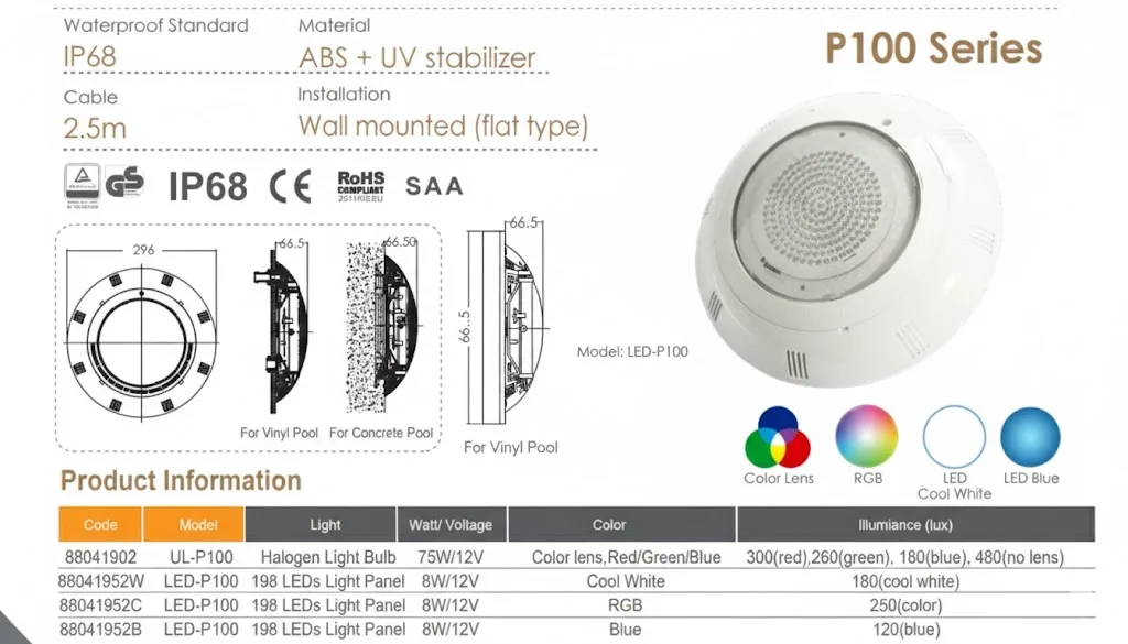 Reflektor P100 RGB 8 W Emaux (88041952C) spada u P100 seriju LED bazenske rasvete — kompaktnih svetlosnih jedinica koje se montiraju direktno na zid bazena bez potrebe za niche kućištem. Ovaj model koristi 198 LED dioda koje rade na niskom naponu (8 W / 12 V) i automatski menjaju boje, što stvara atraktivne vizuelne efekte u vodi.