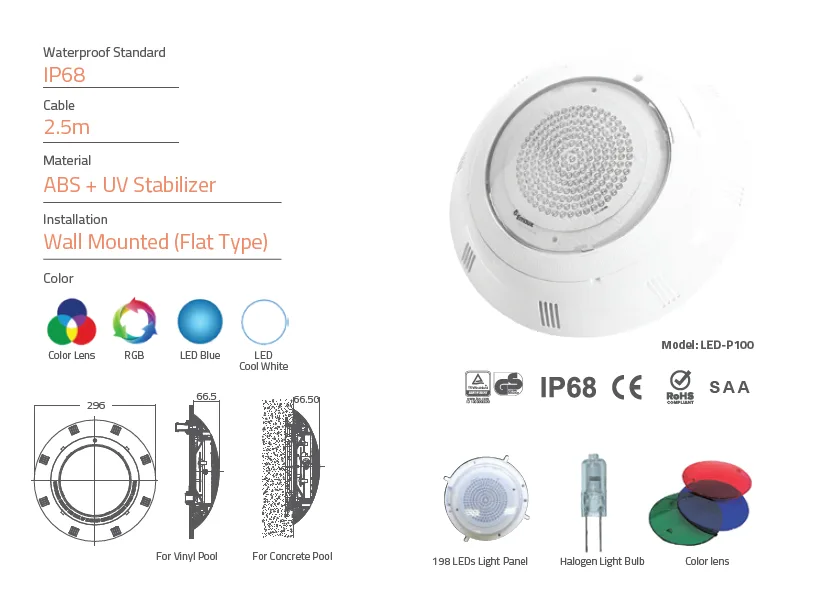 Reflektor je izrađen od otpornog i vodootpornog materijala, pogodan za montažu na bočnu stranu bazena (nadzidno), bilo u betonske ili PVC lajner bazene uz odgovarajući set za montažu. Dizajniran je da izdrži uticaje vlage, UV zračenja i hemijskih tretmana vode, čime se obezbeđuje dugotrajno i pouzdano funkcionisanje.