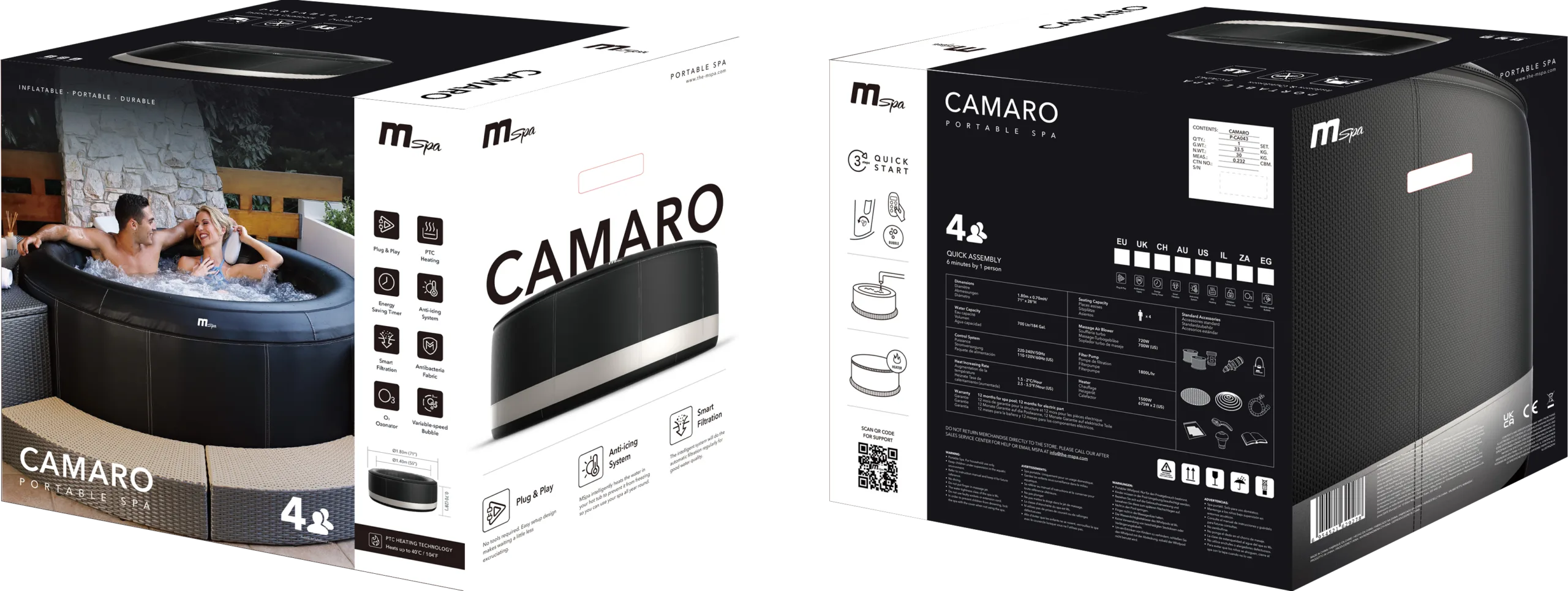 MSPA CAMARO je luksuzna hidromasažna kada za 4 osobe sa 118 mlaznica, grejačem, ozonoterapijom i elegantnim dizajnom u stilu ugljeničnih vlakana.