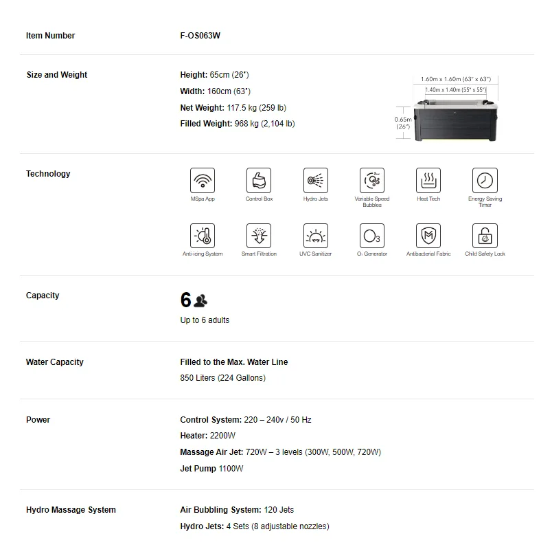 Sa dimenzijama 1,60 × 1,60 × 0,65 m, ova hidromasažna kada nudi dovoljno prostora za do 6 osoba, bez kompromisa po pitanju udobnosti. Zapremina od 850 litara omogućava brzo zagrevanje i efikasno održavanje temperature vode, dok ukupna težina od 120 kg garantuje stabilnost i sigurnost u upotrebi.