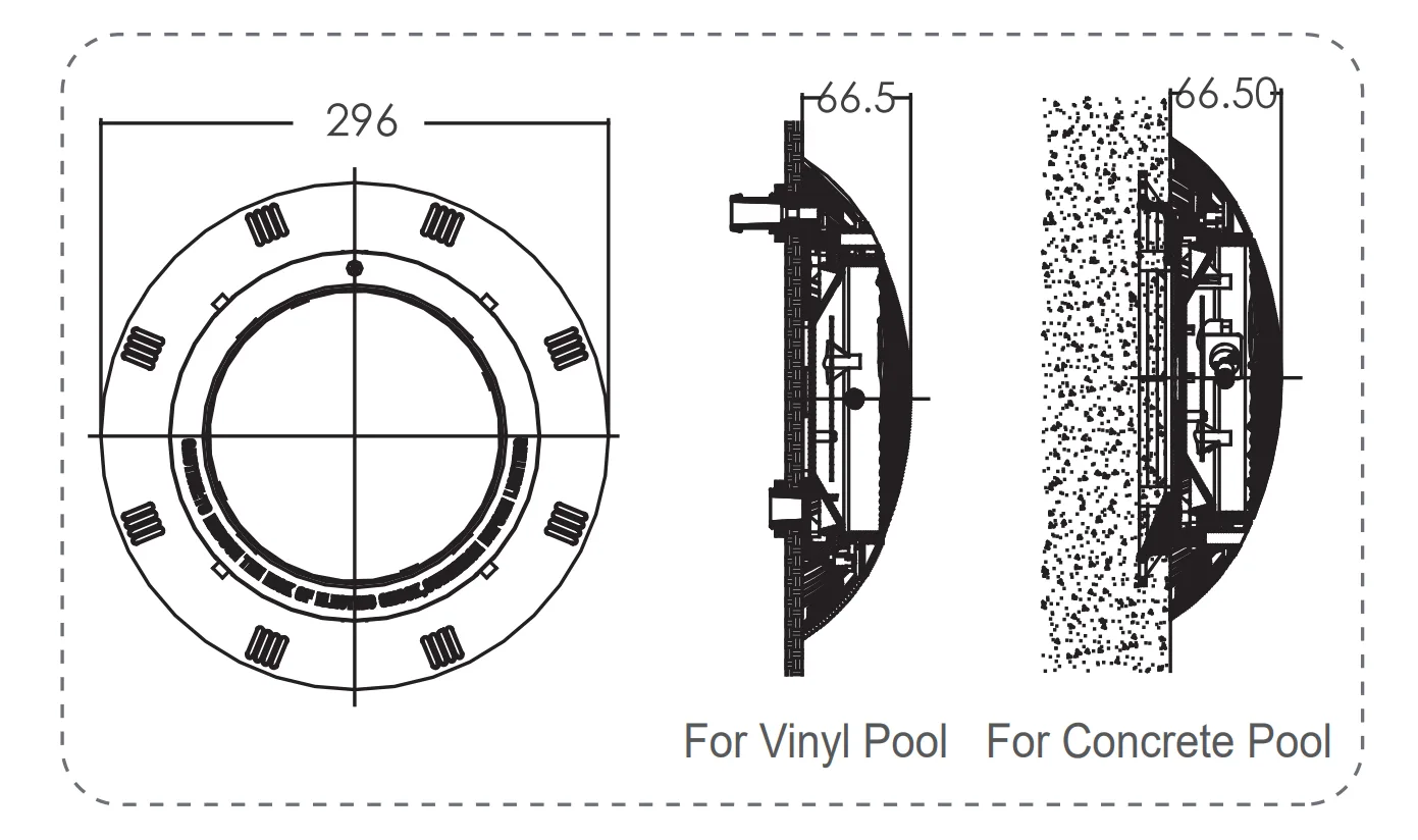 Reflektor se jednostavno montira na zid bazena (nadzidno) i povezuje sa transformatorom niskog napona, pružajući stabilan i pouzdan rad bez dodatnog kućišta za ugradnju.