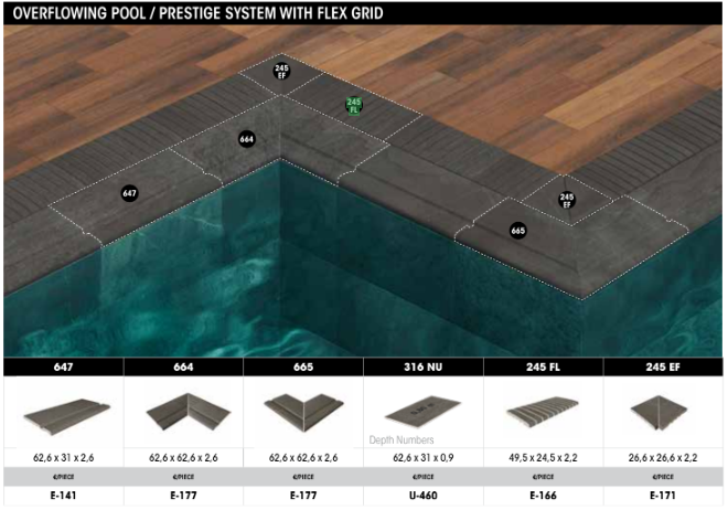 Prelivna rešetka Rosa Gres model E-166 FL dimenzija 49,5 x 24,5 x 2,2 cm (dužina segmenta 245 cm) predstavlja savršen spoj funkcionalnosti i estetike za prelivne bazene, omogućavajući efikasno prikupljanje i odvođenje vode iz bazenskog prostora.